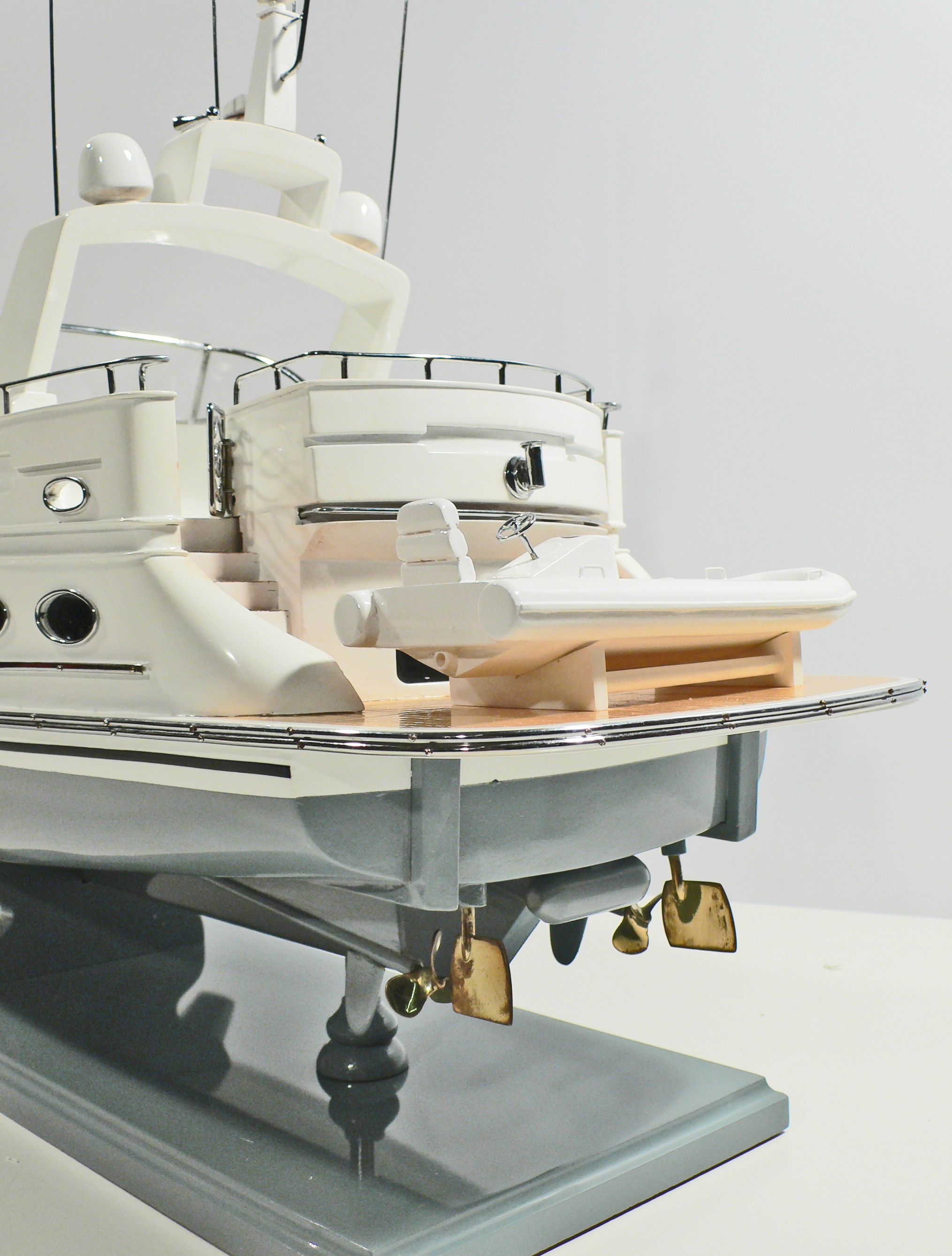 Der Rumpf wird nach der Fertigstellung feinsäuberlich geschliffen und sofern vorgesehen lackiert. Das Modell wird danach mit einem schützenden Klarlack beschichtet.